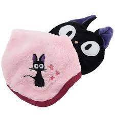 Soft Studio Ghibli Micro Loop Towel from Marushin. Features character towel cover (3.5 x 4.7") and attached microfiber towel (9.8 x 9.8") with embroidered image. Microfiber towel can be rolled up into towel cover. Cover features a loop for hanging. Jiji themed from the Studio Ghibli film "Kiki's Delivery Service".